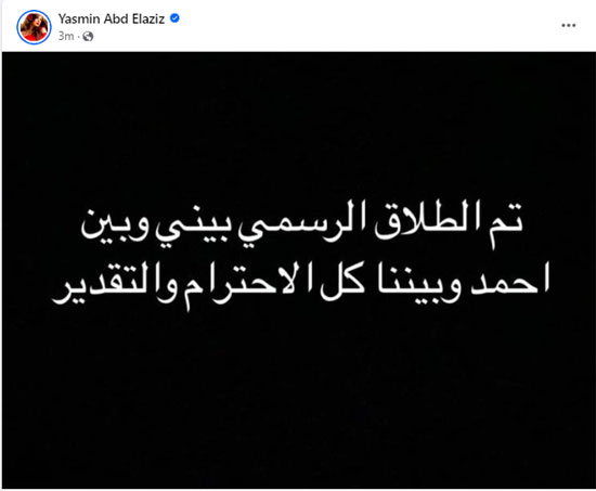 منذ قليل وعلى صفحتها الرسمية على "إنستجرام" أعلنت النجمة ياسمين عبد العزيز عن طلاقها من النجم أحمد العوضي.