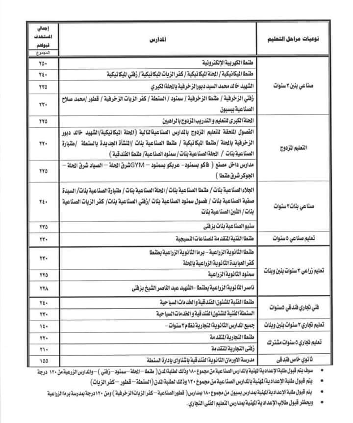 اعتمد الدكتور طارق رحمي، محافظ الغربية، اليوم، الحد الأدنى للقبول بالتعليم الفني بجميع نوعياته، وذلك بناء على الدراسة المقترحة لتنسيق القبول للصف الأول الثانوي الفني للعام الدراسي 2020 / 2021 ، والمقدمة من ناصر حسن، وكيل وزارة التربية والتعليم بالغربية، وذلك في ضور تنفيذ التعليمات المنظمة لذلك للطلاب الحاصلين على شهادة إتمام الدراسة بمرحلة التعليم الأساسي للعام الدراسي المنقضي 2019 / 2020، حيث تقرر أن يكون التنسيق وفقاً للجدول المرفق.