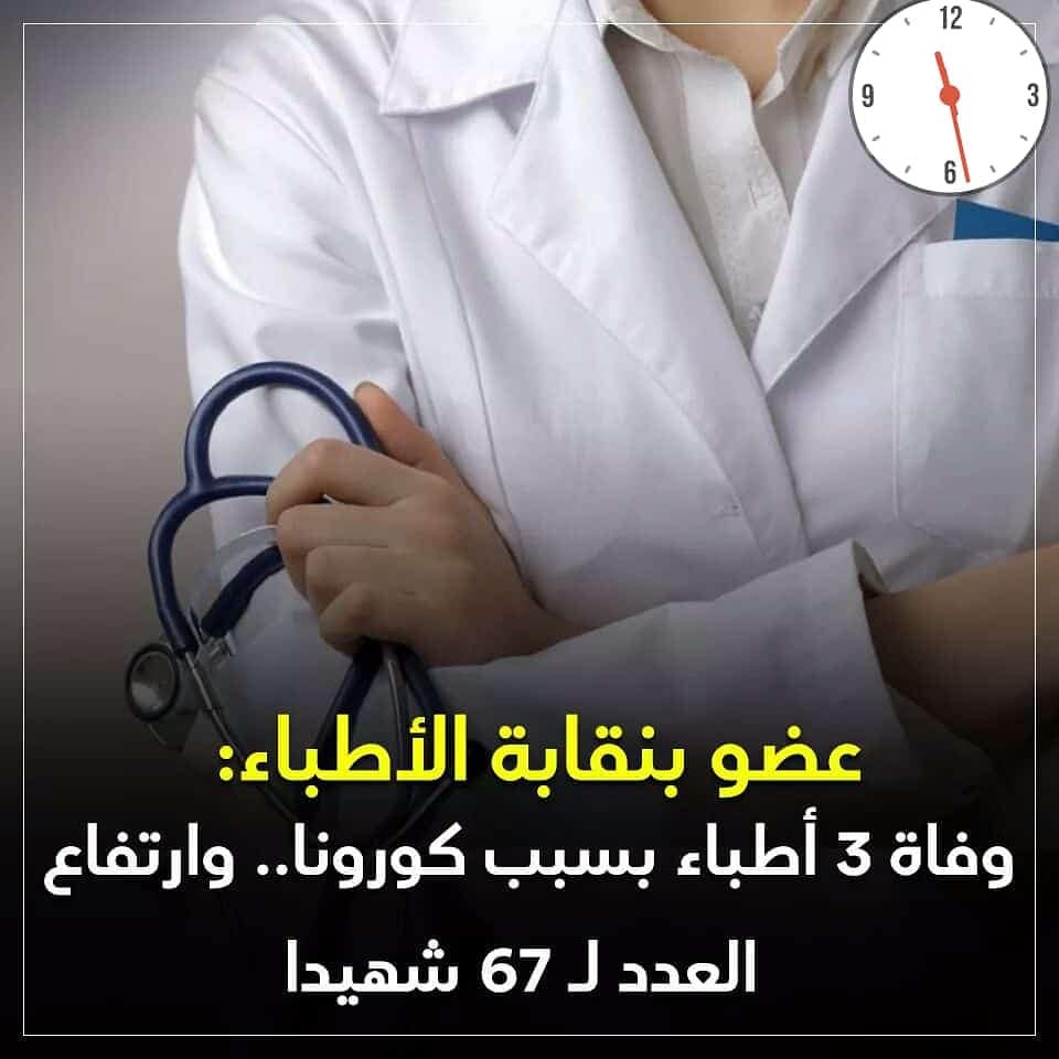 قال الدكتور إبراهيم الزيات، عضو مجلس النقابة العامة للأطباء، إن عدد شهداء الأطباء نتيجة الإصابة بفيروس كورونا المستجد، بلغ حتى الآن 67 طبيبا، وذلك بعد إعلان وفاة كل من: الدكتور أحمد الزفتاوي كبير استشاري الصدر المنصورة، الدكتور علي حسن العربى استشاري الكبد، بمستشفى الساحل، الدكتورة أميل فوزى اخصائى الجراحة بمستشفى ابشواى، وذلك بعد إصابتهم بفيروس كورونا المستجد، داعيا الله أن يغفر لهم وأن يدخلهم فسيح جناته.