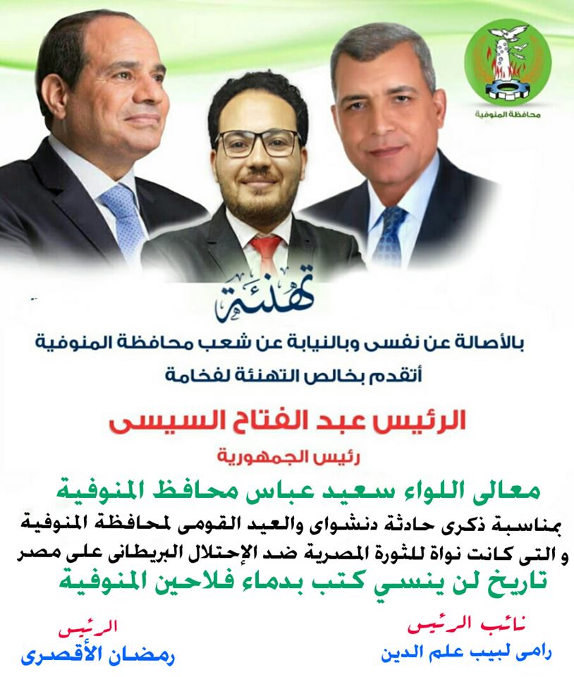 هنا الدكتور رامى لبيب علم الدين نائب رئيس حزب مصر 2000 بالخارج ، وعضو المجلس الرئاسي للاتحاد العالمى للمواطن المصرى بالخارج فرع مملكة البحرين، فخامة الرئيس عبدالفتاح السيسي ومعالى اللواء سعيد عباس محافظ المنوفية ، ومعالى اللواء سمير ابو زامل مدير أمن المنوفية ، وكافة القيادات بمحافظة المنوفية وشعبها العظيم فى ذكرى العيد القومى للمحافظة الذى يتواكب مع أحداث دنشواى ١٩٠٧ التى كانت شرارة ثورة المصريين ضد الإحتلال البريطانى . وقال "علم الدين" فى بيان له لجريدة "شبكة مصر 24" ، نقدم خالص تهانيه لشعب المنوفية بهذه المناسبة العظيمة ، معرباً عن سعادتة البالغة بهذا اليوم الذي جسدت بطولات المصريين وتضحياتهم وتمسكهم بوطنهم وأن هذه الذكري لن ينساها العالم أجمع فدنشواى قرية مصرية هزت عرش إمبراطورية الإحتلال الإنجليزى ، مشيراً إلى الدور الرائد الذى لعبه أبناء المنوفية على مر العصور ابتداءاً بدنشواى وقرى منوف وكمشيش الصامدة وما قبلها وحتى الآن ، مضيفا أن المنوفية كانت ولا تزال منبع السياسة المصرية ومعقل العلم والزعماء ، ومعربا عن فخره واعتزازه كونه أحد أبناء الشهداء ويعتز بجزوره المنحدرة لقرية كمشيش أحد أطراف الحادثة البشعة ، ومرددا قصيدة الشاعر حافظ إبراهيم عن حادثة دنشواي : - قتيل الشمس أورثنا حياة . . وأيقظ هاجع القوم الرقود - فليت كرومر قد بات فينا . . يطوق بالسلاسل كل جيد - لننزع هذه الأكفان عنا . . ونبعث في العوالم من جديد كما أوضح على أن شعب المنوفية نسيج واحد ويداً واحدة يعى ويقدر الحفاظ على وطنه مضيفا أن هذا اليوم سيظل أبد الدهر عيدا نحتفل به بما يعزز قيم الإنتماء وترسيخ الوطنية في قلوب المصريين ، داعيا المولي عز وجل أن يعم علينا وعلى مصرنا الغالية الخير والنماء والتقدم وأن تظل راية مصر عالية خفاقة تحت القيادة الرشيدة لفخامة الرئيس عبدالفتاح السيسى رئيس الجمهورية .