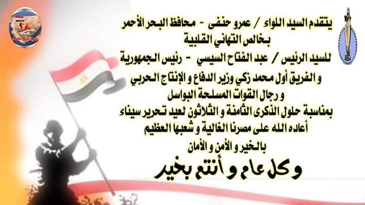 قدَّم سيادة اللواء عمرو حنفي محافظ البحر الأحمر التهنئة للسيد رئيس الجمهورية عبدالفتاح السيسي، الفريق أول محمد زكي وزير الدفاع والإنتاج الحربي، و رجال القوات المسلحة البواسل بمناسبة حلول الذكرى الثامنة و الثلاثين لعيد تحرير سيناء، متمنياً أن يُعيده الله على مصرنا الغالية و شعبها العظيم بالخير و الأمن و الأمان.
