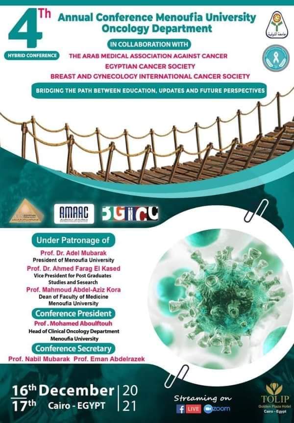 تنطلق غدا الخميس فعاليات المؤتمر الدولي الرابع لقسم علاج الأورام بكلية الطب جامعة المنوفية ،تحت رعاية الدكتور عادل مبارك رئيس الجامعة ، والدكتور أحمد فرج القاصد نائب رئيس الجامعة لشئون الدراسات العليا و البحوث والدكتورة نانسي أسعد نائب رئيس الجامعة لشئون لتعليم و الطلاب ، والدكتور محمود قورة عميد كلية الطب ،ياتي المؤتمر( تحت عنوان الرابط بين التعليم والتدريب والمستجدات والآفاق المستقبليه في علاج الأورام )