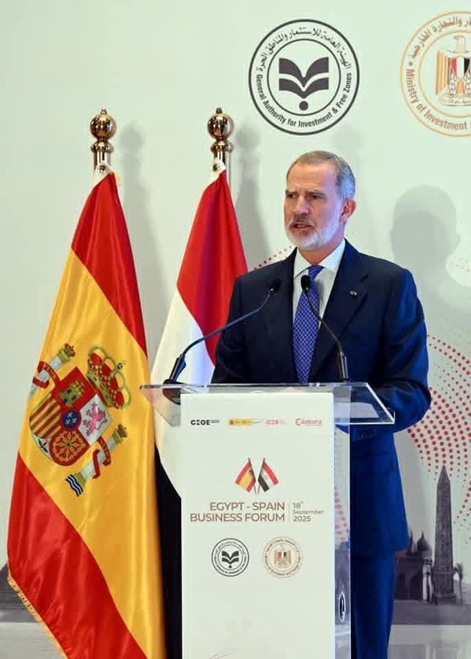 وأوضح جلالة الملك، خلال كلمته، أن العلاقة بين البلدين تُعد علاقة ناضجة وديناميكية، لافتًا إلى أنه في عام 2024 بلغت الصادرات الأسبانية إلى مصر مليارًا و457 مليون يورو، بينما تجاوزت واردات أسبانيا 1.6 مليار يورو، وهي أرقام تعكس الثقة المتبادلة، وتظهر إمكانات أكبر للتوسع بين البلدين، قائلًا: لهذا نحن هنا؛ لتحويل هذه الإمكانات إلى مشروعات ملموسة وفرص استثمارية جديدة -علاوة على تلك القائمة بالفعل- وكذا شراكات تجارية، واستثمار جديد ومستدام، وذلك بما يعود بالنفع على مجتمعاتنا.