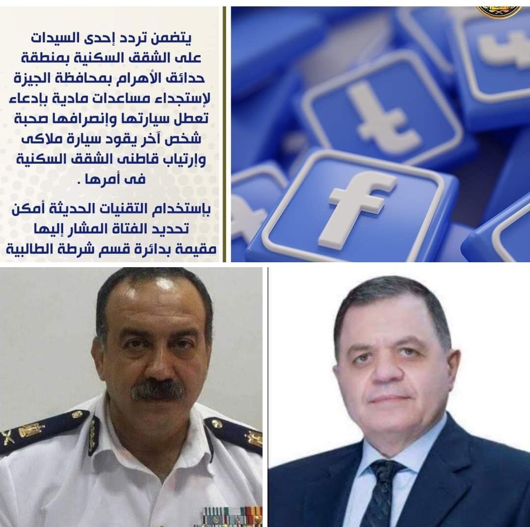 اللواء عبدالعزيز سليم مدير مباحث الجيزة ملابسات تداول منشور على موقع التواصل الإجتماعى "فيس بوك" يتضمن تردد إحدى السيدات على الشقق السكنية بمنطقة حدائق الأهرام بمحافظة الجيزة لإستجداء مساعدات مادية بإدعاء تعطل سيارتها وإنصرافها صحبة شخص آخر يقود سيارة ملاكى.. وإرتياب قاطنى الشقق السكنية فى أمرها .