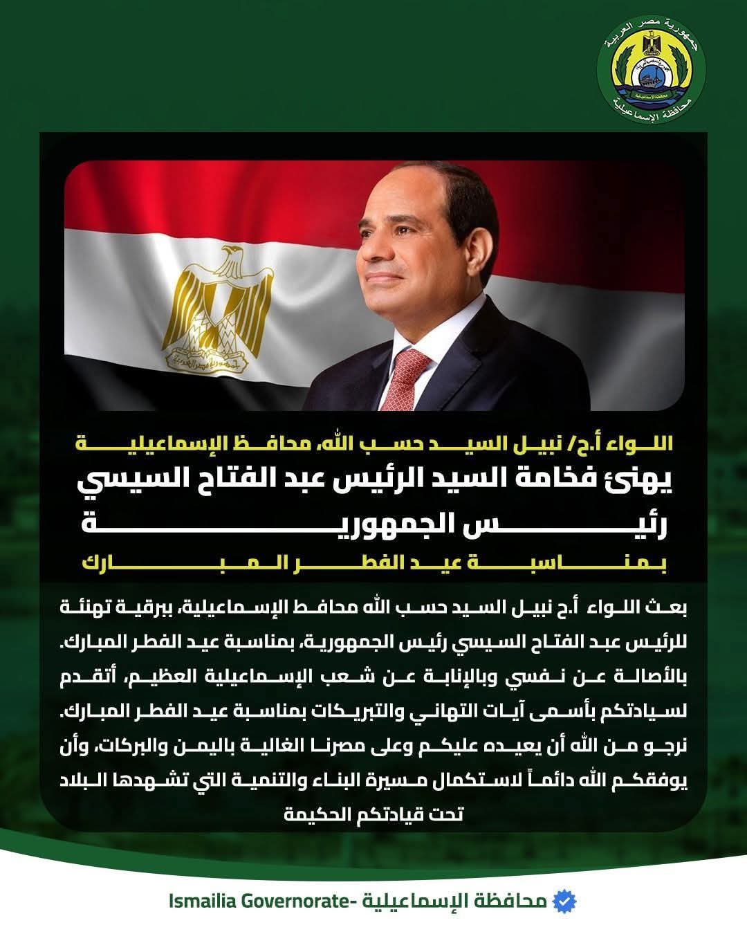 أرسل اللواء أ.ح نبيل السيد حسب الله محافظ الإسماعيلية، برقية تهنئة للسيد الرئيس عبد الفتاح السيسي، رئيس الجمهورية، بمناسبة حلول عيد الفطر المبارك للعام الهجري ١٤٤٧ هـ.