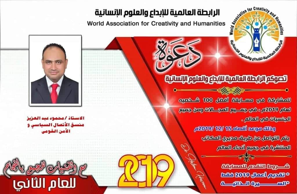 أنباء عن إختيار الرابطة العالمية للإبداع والعلوم الانسانية محمود عبد العزيز منسق الإتصال السياسي والأمن القومي من افضل 100شخصية في مسابقة افضل 100شخصية في جميع المجالات وبمشاركة جميع جنسيات العالم