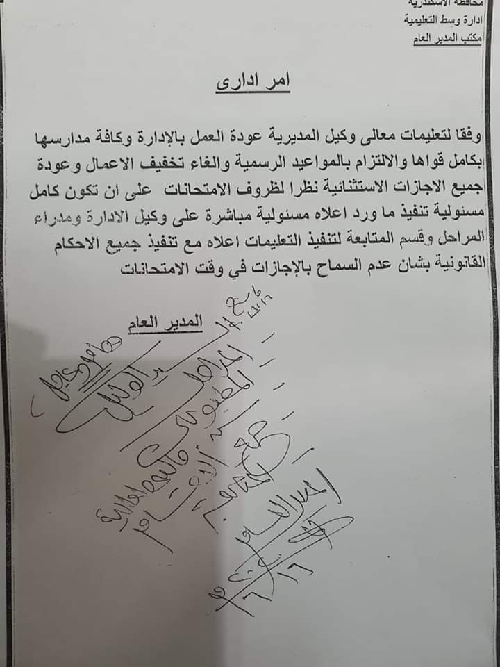 قررت مدير عام ادارة وسط بالإسكندرية ايمان شرف بالغاء الاجازات لكل العاملين بالادارات، رغم قرار السيد رئيس الوزراء وخاصة في هذا التوقيت والذي استعدت فيه الدولة لامتحانات الثانوية العامة وسعيها لتقليل الاعداد في اللجان وصرف الملايين لتجهيز اللجان وتعقيمها.