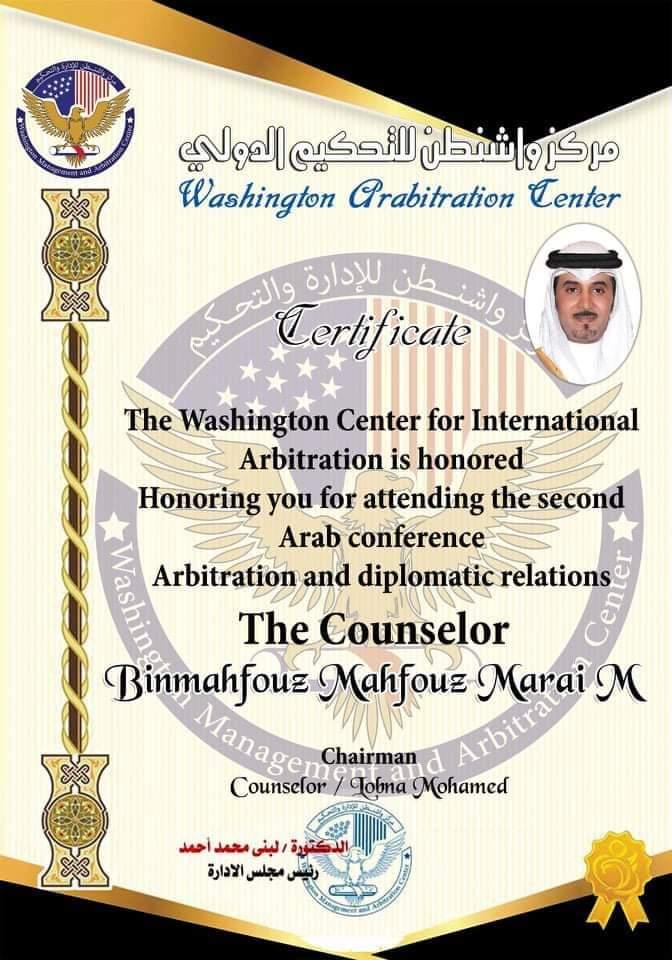 قام مركز واشنطن للتحكيم الدولي بتكريم الدكتور محفوظ بن مرعى بن مبارك بن محفوظ بمنحه شهادة شكر وتقدير لدوره البارز في خدمة الانسانيه والمجتمع من أجل السلم والسلام والمحبة بين الشعوب ودوره البارز في المساعدات والمساهميات التي يقوم بها ودعمه بعدة كراتين لدعم الأسر الفقيرة محدودي الدخل والأسر المعيلة