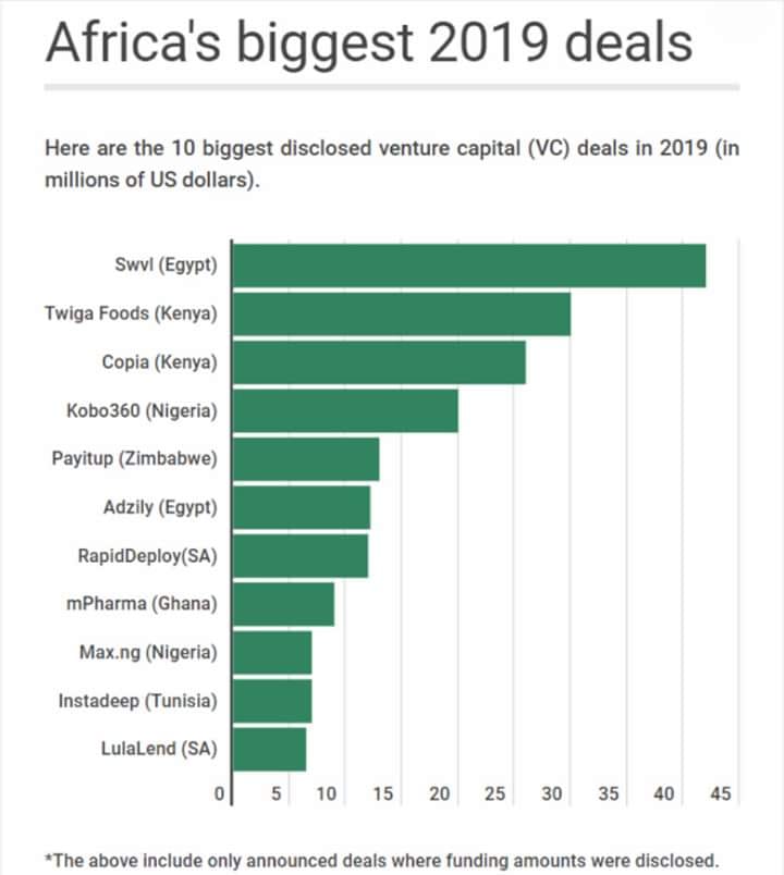 سويفل تتصدر صفقات التمويل في القارة: استطاعت شركة النقل الجماعي الذكي المصرية سويفل جمع 42 مليون دولار في جولة تمويلية ثانية، لتتصدر بذلك صفقات التمويل بالشركات الأفريقية الناشئة لهذا العام، وبما يمثل نحو 57% من إجمالي التمويل الذي حصلت عليه الشركات المصرية الناشئة في 2019. وقادت تلك الجولة شركة رأس المال المخاطر السويدية فوستوك فينتشرز، إلى جانب شركة بيكو كابيتال الإماراتية، وسواري فينتشرز المصرية، وإم إس أيه الصينية، وإنديفور كاتاليست الأمريكية، وجسور فينتشرز العمانية، وأرزان فينتشرز الكويتية، وبلوستون الإماراتية، وأوتوتك الأمريكية، والرئيس التنفيذي لشركة بروبرتي فايندر مايكل لاهياني.