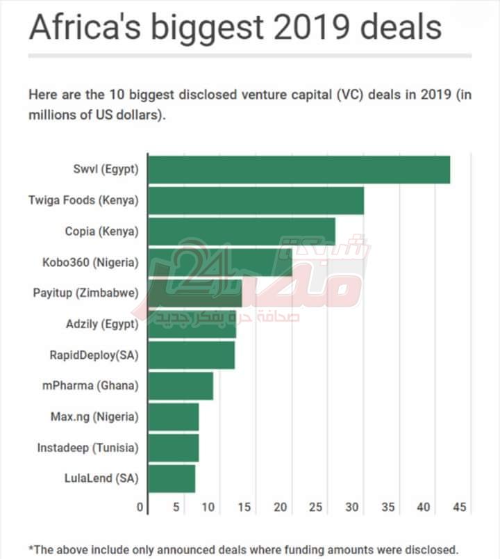إستحوذت الشركات المصرية الناشئة على أكبر عدد وأعلى قيمة تمويل من صفقات رأس المال المخاطر الموجهة للشركات الأفريقية الناشئة في مراحلها الأولية خلال 2019، وفقا لما ذكره موقع فينتشر بيرن. ومن بين 88 صفقة لرأس المال المخاطر جرى الإعلان عنها، بقيمة إجمالية 290 مليون دولار جمعتها شركات أفريقية خلال 2019، عقدت الشركات المصرية 24 صفقة، بقيمة إجمالية 73.3 مليون دولار.