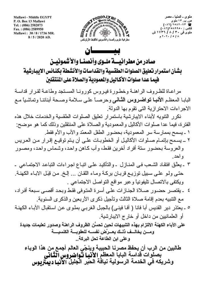 اصدرت مطرانية ملوي وانصنا والأشمونين بيانا هاما بخصوص استمرار تعليق الصلوات والقداسات والانشطة بالكنيسة، ونوهت على اشياء هامة واثنت على بعض الامور التي تتعلق بالانشطة الخدمية بالكنيسة كالآتي :