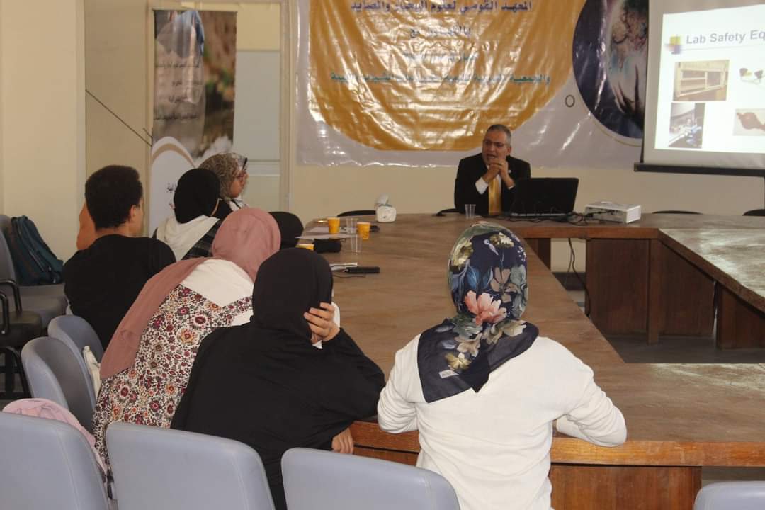 وقام الاستاذ الدكتور أحمد عبد الحليم مدير فرع المعهد بالسويس والأستاذ بشعبة البيئة البحرية بالمعهد بالقضاء محاضرتين جاءت المحاضرة الأولى بعنوان "طرق الأمان المعملية" والذى تحدث فيها عن محاضرة عامة عن مراقبة الجودة فى المعامل مع شرح مفصل عن الطرق الأمنة المعملية وكيفية التعامل مع أدوات المعامل والعلامات الموجودة داخل المعمل.