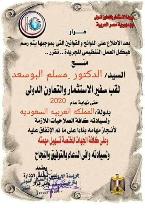 قال السفير الدكتور مسلم البوسعد أتقدم بالشكر والتقدير الى رئيس وأعضاء مجلس إدارة جريدة الاستثمار والتعاون الدولي على منحي سفير الأستثمار والتعاون الدولي واعتز بثقتكم الغالية وأسأل المولى عز وجل أن أكون عند حسن ظنكم وثقتكم بي وبخبراتي وبأن أكون مؤديا لرسالتي على أكمل وجه مهما كانت الظروف المحيطة بي