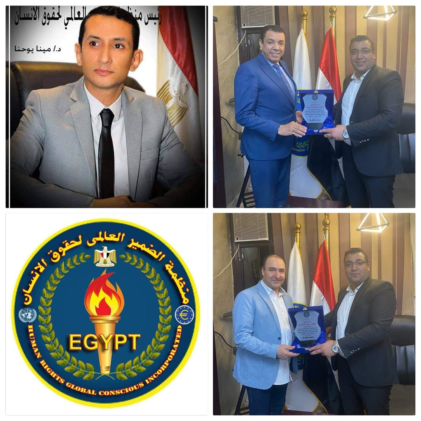 تحت رعاية الدكتور مينا يوحنا يوسف مدير عام منظمة الضمير العالمي لحقوق الإنسان قام اليوم مدير فرع منظمة الضمير العالمي لحقوق الإنسان بحلوان المستشار . محمد توفيق باهداء درع التميز لكلآ من