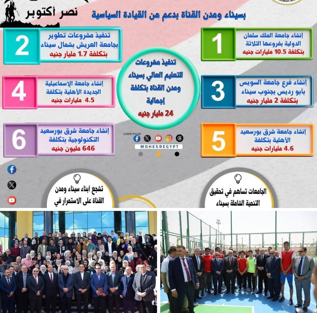 حظي قطاع التعليم العالي والبحث العلمي بدعم من جانب القيادة السياسية، وساهم ذلك في تحقيق التنمية في هذا الإقليم الهام في ظل "الجمهورية الجديدة".في إطار احتفالات جمهورية مصر العربية بحلول الذكرى الـ52 لانتصارات أكتوبر المجيدة، وفي ضوء الاهتمام الكبير الذي توليه القيادة السياسية للمشروعات القومية الكبرى، وخاصة في شبه جزيرة سيناء ومدن القناة