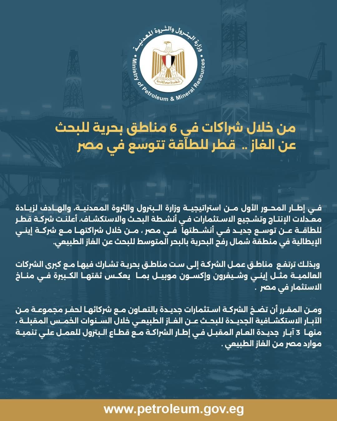 أعلنت شركة قطر للطاقة عن توسع جديد في أنشطتها في مصر ، من خلال شراكتها مع شركة إيني الإيطالية في منطقة شمال رفح البحرية بالبحر المتوسط للبحث عن الغاز الطبيعي.