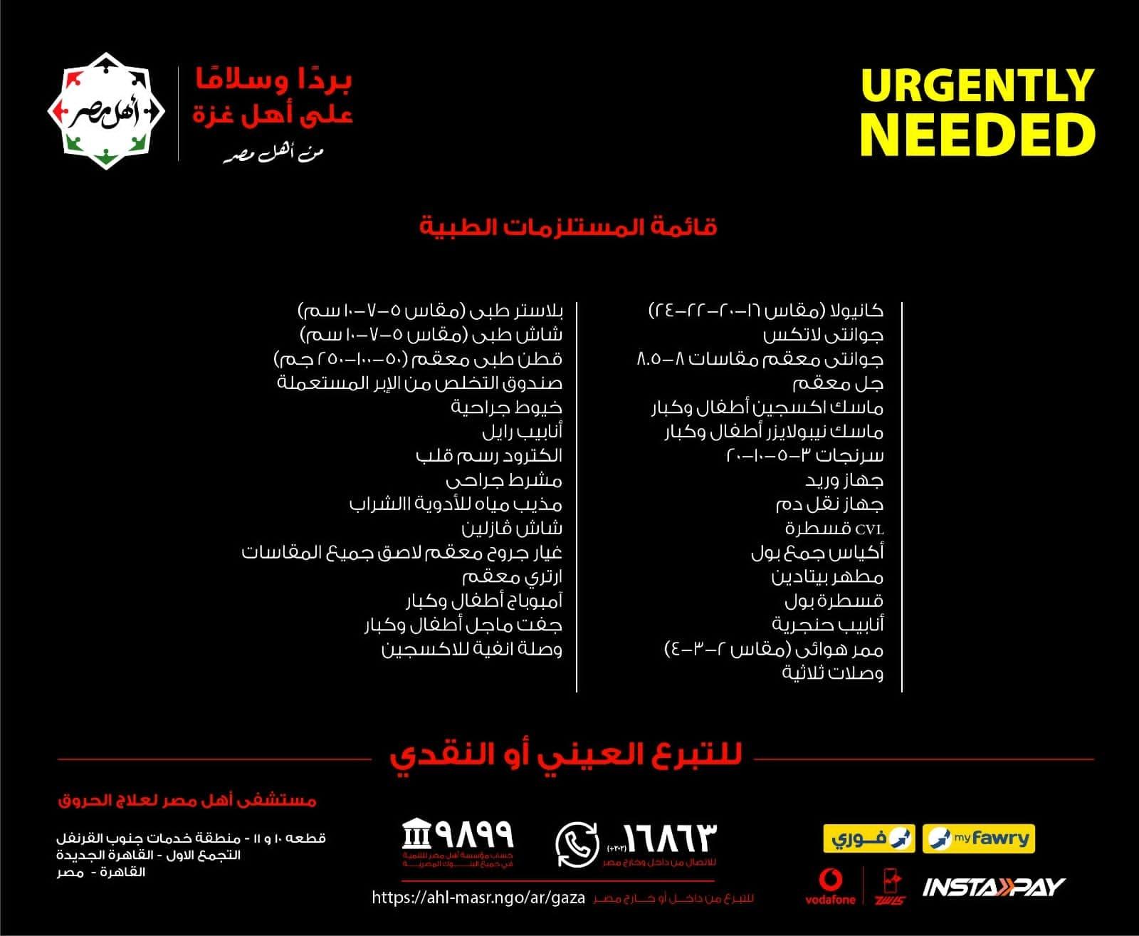 ١-تقوم مؤسسة و مستشفى أهل مصر لعلاج الحروق بتجهيز قافلة لغزة بالأدوية والمستلزمات الطبية اللازمة للعمليات والرعاية الحرجة وأدوية ومستلزمات طبية لحالات اصابات الحروق.