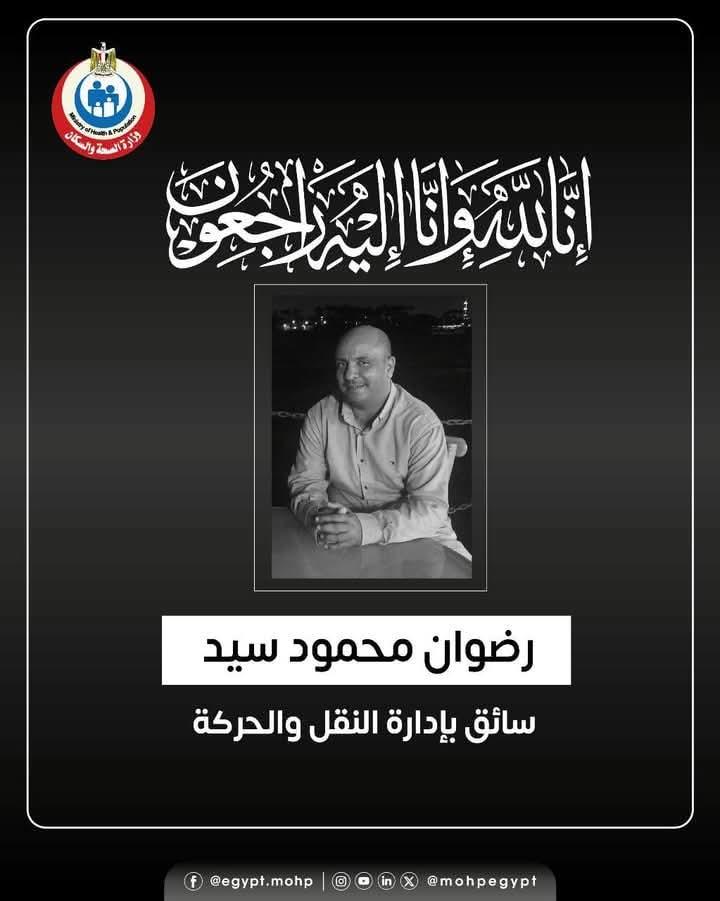 نعي الدكتور خالد عبد الغفار، نائب رئيس مجلس الوزراء ووزير الصحة والسكان، وجميع العاملين بالوزارة والجهات التابعة لها، ببالغ الحزن والأسى، الفقيد رضوان محمود سيد – سائق بإدارة النقل والحركة – داعين المولى عز وجل أن يتغمد الفقيد بواسع رحمته، ويسكنه فسيح جناته، ويلهم أهله وذويه الصبر والسلوان.