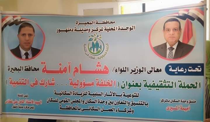 حيث كلف" كامل على غطاس" رئيس مركز ومدينة دمنهور مقرره لجنه السكان بالوحده المحليه الاستاذه اميمه المسيرى و مديره العلاقات العامه بالتنسيق و التواصل مع الجهات الشريكة و المعنيه و الاستاذ اشرف السعيد شعبان رئيس القرية لأقامه الندوة السكانيه و التى افتتحتها منسق اللجنه السكانية توجيه الشكر لرئيس الجمهورية و اللواء هشام امنه محافظ البحيره و نقلت شكر الاستاذ كامل على غطاس رئيس المدينة لأهالى القريه