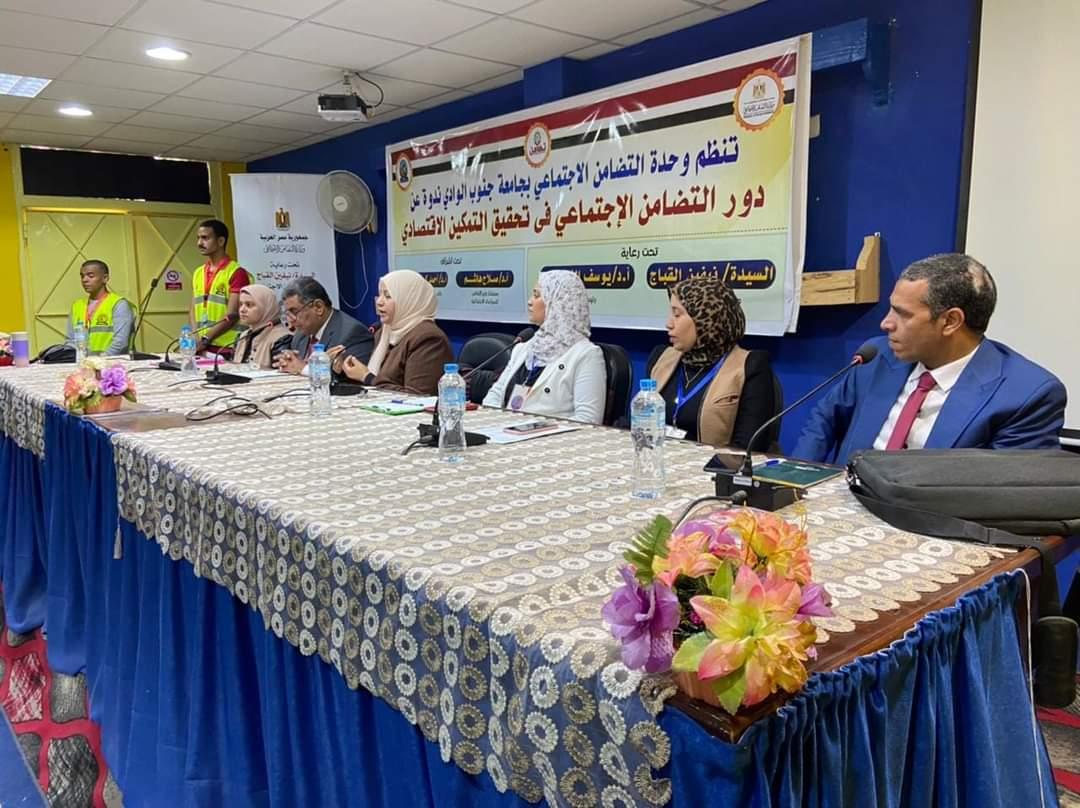 نظمت كلية التربية النوعية بجامعة جنوب الوادي ندوة عن دور وزارة التضامن الاجتماعى فى التمكين الاقتصادى وذلك تحت رعايه الدكتور يوسف غرباوي رئيس الجامعة واشراف الدكتور أحمد كمال نصارى نائب رئيس الجامعة لشئون خدمة المجتمع وتنمية البيئة والدكتور محمد سعيد عميد الكلية والدكتوره بدريه حسن علي وكيل الكليه لخدمة المجتمع وتنميه البيئه حيث ناقشت ابندوة دور وزاره التضامن الاجتماعي فى تحقيق التمكين الاقتصادي وفق رؤية مصر للتنمية المستدامة ٢٠٣٠ وخاصة محور العدالة و التنمية و بناء الانسان .