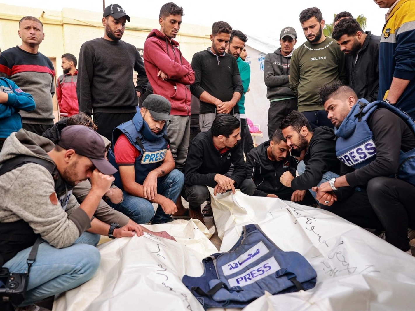 وذكرت نقابة الصحفيين الفلسطينيين في تقريرها السنوي، اعتقال نحو 58 صحفيا وصحفية منذ 7 أكتوبر في الضفة الغربية وغزة، وتسجيل 49 حالة اعتداء على صحفيين من قبل المستوطنين في الضفة الغربية. وقال نقيب الصحفيين الفلسطينيين ناصر أبو بكر، خلال مؤتمر صحفي، عقد في مقر النقابة بمدينة البيرة، اليوم الخميس، ، إن نقابة الصحفيين والاتحاد الدولي للصحفيين واتحاد الصحفيين العرب يعتبر أن ما يحدث في قطاع غزة أكبر مجزرة في تاريخ الإعلام، وبحق الإعلام في العالم في أقصر فترة زمنية، حيث استشهد أكثر من 100 صحفي، أي ما يعادل 8.5% من عدد الصحفيين في القطاع.