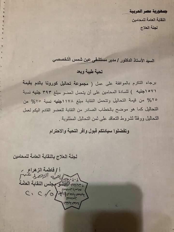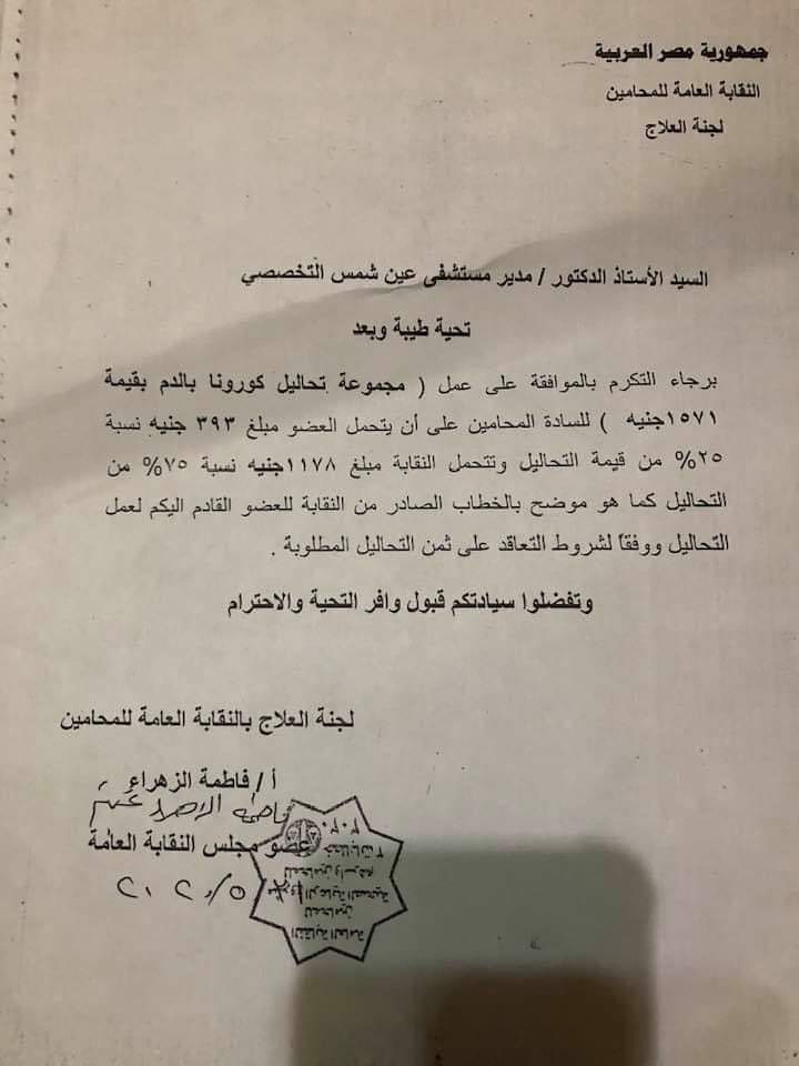 تم تعاقد النقابة العامة للمحامين مع مستشفي عين شمس التخصصي لعمل كافة تحليلات فيروس كورونا لأعضائها المحامين علي ان يتحمل العضو نسبة ٢٥% بقيمة ٣٩٣ جنيه فقط من قيمة التحليلات البالغة مبلغ ١٥٧١ جنيه بينما تتحمل النقابة بقية المبلغ وبنسبة ٧٥ % وهي بقيمة ١١٧٨جنيه.