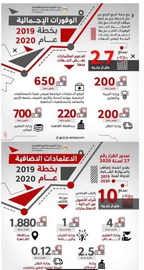 وزارة التخطيط والتنمية الاقتصادية تعلن الاعتمادات الإضافية، والوفورات الإجمالية بخطة عام 2019/2020 د/هالة السعيد: 10 مليار جنيه اعتماد إضافي بالموازنة العامة للدولة للسنة المالية 2019/2020 للحد من الآثار السلبية الناتجة عن انتشار فيروس كورونا2,7 مليار جنيه وفورات إجمالية بخطة عام 2019/2020 تركزت في تدعيم الاستثمارات والاحتياجات الملحة والضرورية لبعض الجهات