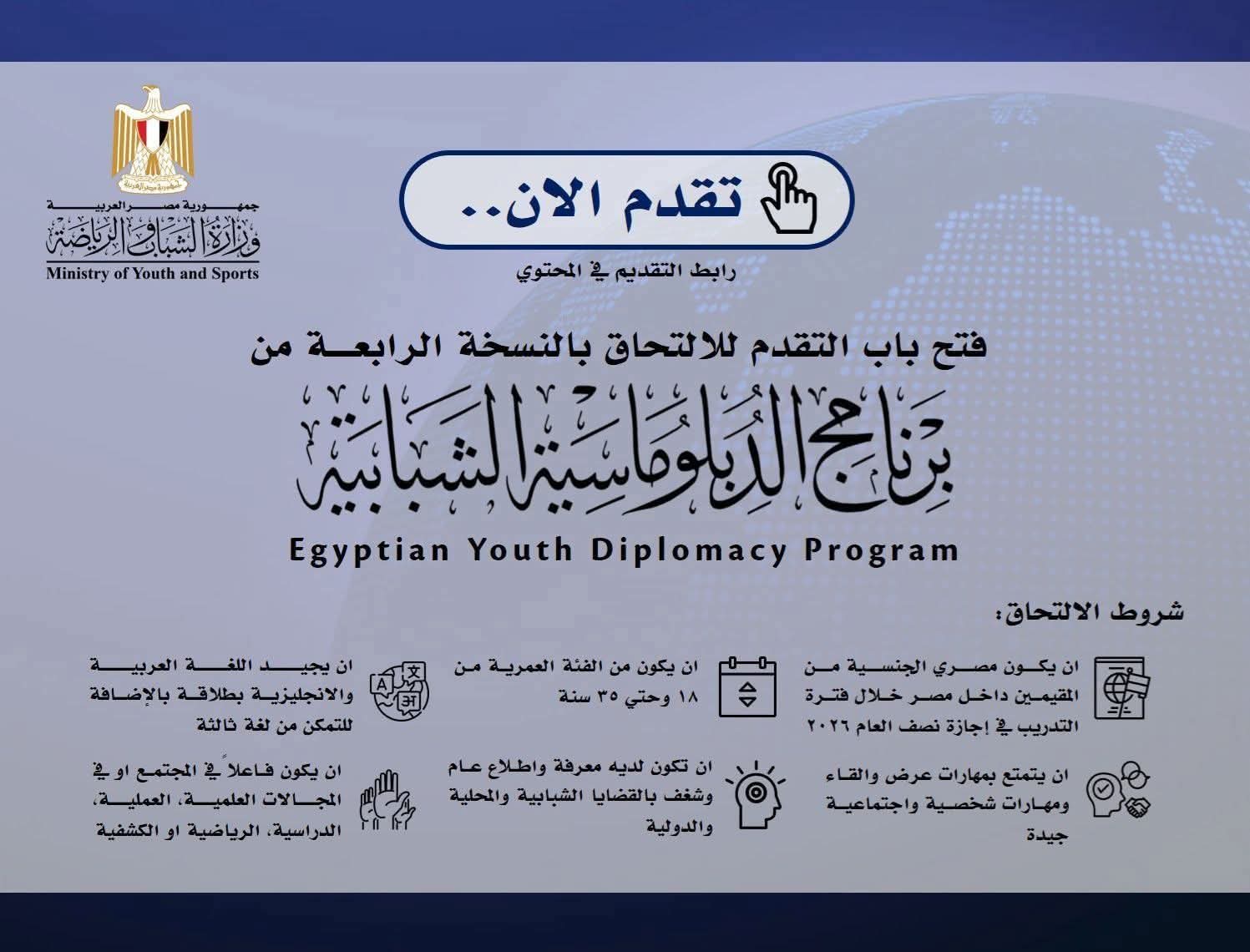 انطلاقاً من توجهات الدولة المصرية ودعماً لتنفيذ مستهدفات الاستراتيجية الوطنية للشباب والرياضة 2025–2030، وفي إطار تعزيز مفهوم الدبلوماسية الشبابية ودورها في تمكين الشباب المصري من التفاعل الفاعل على الساحة الدولية، تعلن وزارة الشباب والرياضة، بتوجيهات من الأستاذ الدكتور أشرف صبحي وزير الشباب والرياضة، عن فتح باب التقدم للدفعة الرابعة من برنامج الدبلوماسية الشبابية.