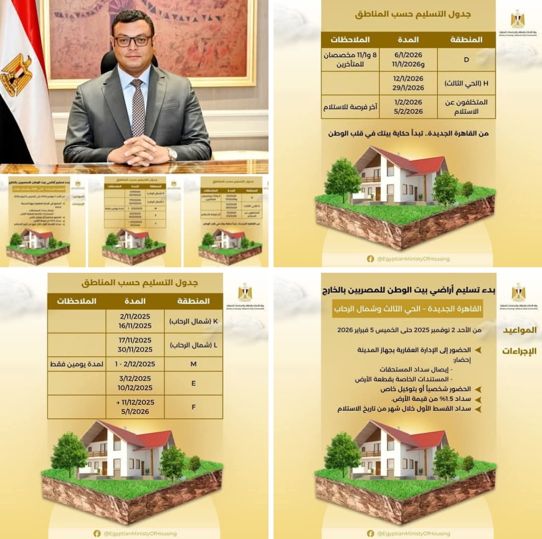 وأعلن رئيس الجهاز أنه سيتم تسليم قطع أراضي بيت الوطن بالمنطقة (H) بالحي الثالث خلال الفترة من يوم الإثنين 12/1/2026 وحتى يوم الخميس 29/1/2026، وتخصيص الأيام من 1/2/2026 : 5/2/2026، للذين تخلفوا عن الاستلام في المواعيد السابقة.