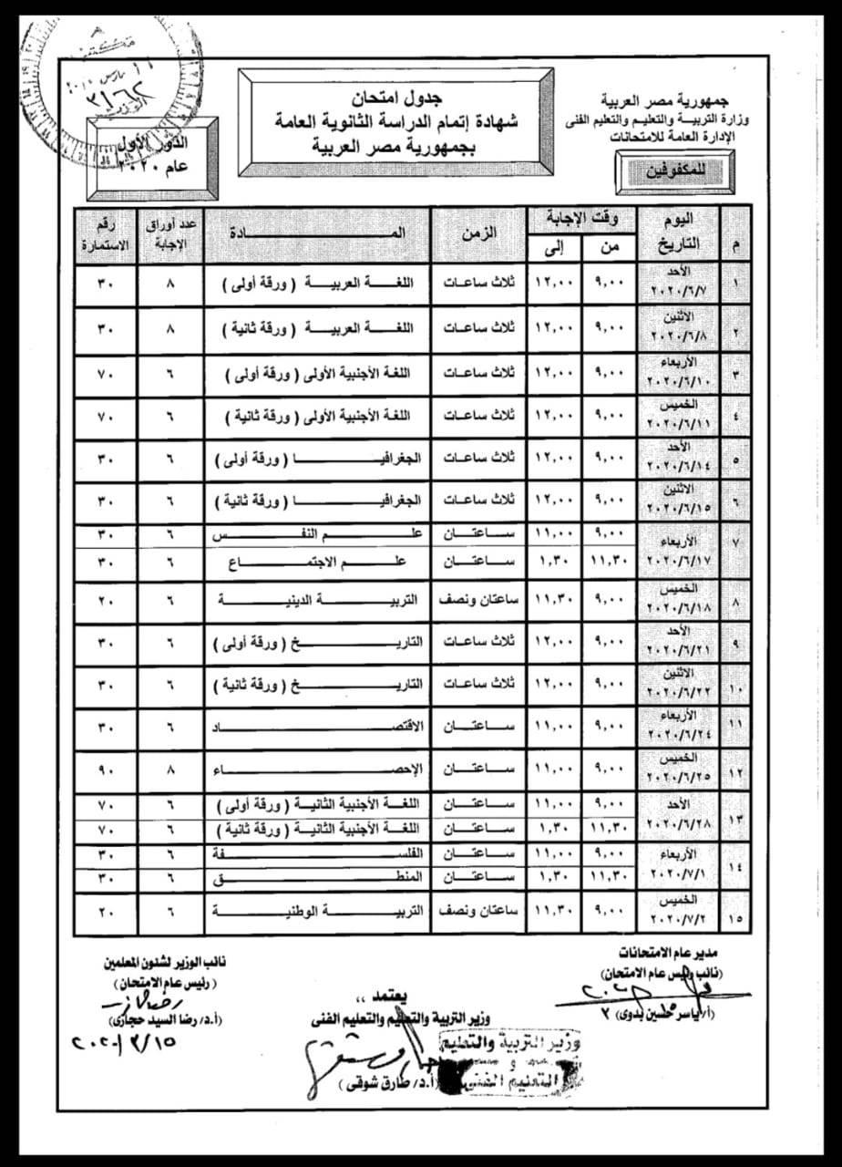 كما اعتمد الوزير أيضًا جدول امتحان شهادة إتمام الدراسة الثانوية العامة بمصر للمكفوفين (الدور الأول) للعام الدراسي الحالي، وتقرر أن تبدأ الامتحانات اعتبارًا من يوم 7 يونيو 2020 وتستمر حتى يوم 2 يوليو 2020.