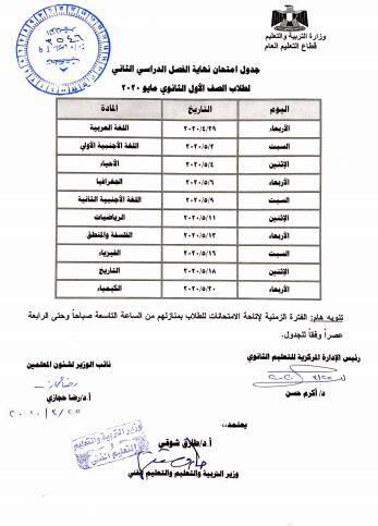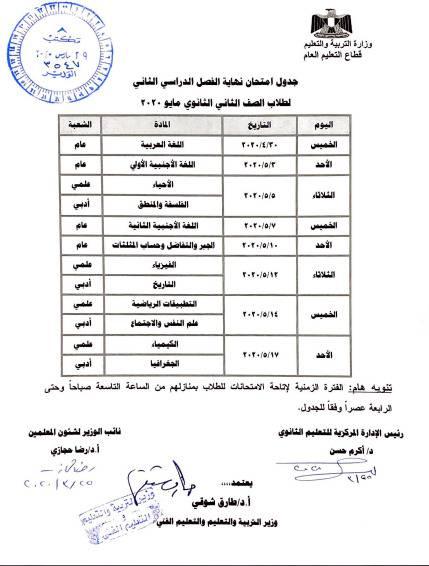 وتبدأ امتحانات الصف الأول الثانوي في الفترة من 29 أبريل حتى 20 مايو 2020، على أن تكون امتحانات الصف الثاني الثانوي في الفترة من 30 إبريل حتى 17 مايو 2020.
