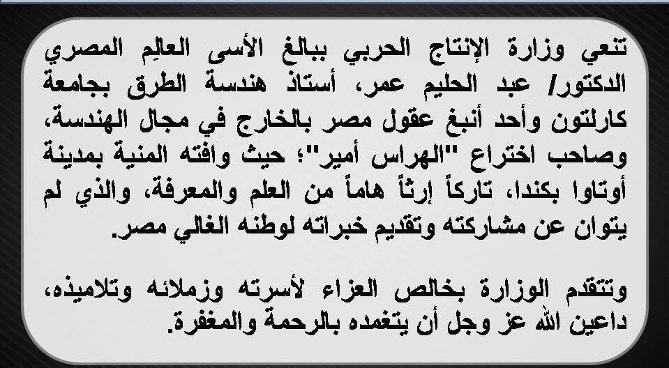 تنعى وزارة الإنتاج الحربي ببالغ الأسى العالم المصرى الدكتور/ عبد الحليم عمر، أستاذ هندسة الطرق بجامعة كارلتون وأحد أنبغ عقول مصر بالخارج فى مجال الهندسة ، وصاحب أختراع ( الهراس أمير) ، حيث وافته المنية بمدينة أوتاوا بكندا ، تاركا إرثا هاما من العلم والمعرفة ، والذى لم يتوان عن مشاركتن وتقديم خبراته لوطنه الغالى مصر . ووتقدم الوزارة بخالص العزاء لأسرته وزملائه وتلاميذه داعين الله عز وجل أن يتغمده بالرحمة والمغفرة . وفى هذا الصدد نود أن نشير إلى أن العالم الراحل الدكتور / عبد الحليم عمر - أستاذ هندسة النقل بجامعة كارلتون كان علي علاقة طيبة ببلده مصر وشارك في مؤتمر مصر تستطيع الذي نظمته وزارة الهجرة وشئون المصريين بالخارج وقدم مشروعات لصالح بلده منها تعاونه مع وزارة الإنتاج الحربي لتصنيع الهراس (أمير-3) لرصف الطرق بدون تشققات بنسبة تصنيع محلي تصل إلي 60%، ليساعد في خلق جيل جديد من معدات رصف الطرق بدون تشققات في الأسفلت مستقبلا. وكان قد تم توقيع اتفاق لتصنيع مكونات الهراس أمير ٣ بين وزراة الإنتاج الحربي والدكتور عبد الحليم عمر و شركة توملينسون في شهر إبريل ٢٠١٨ والذي بموجبه تم تنفيذ الرسومات التصميمة وإعتمادها لأول ( هراس أمير ٣) وتم تصنيع المكونات داخل مصنع إنتاج وإصلاح المدرعات (مصنع ٢٠٠) الحربي ، وتم الإنتهاء من تنفيذها وتصديرها إلى الجانب الكندى فى يوليو ٢٠١٨ لإختبار الهراس بولاية "أوتاوا" من قبل المخترع ( عبد الحليم عمر) بدولة كندا وتم تجربته بنجاح فى أغسطس ٢٠١٨ ، تمهيدا للإنتاج الكمي للهراس والتصدير لدول العالم ومنها كندا ، وقد تم التعاقد مع وزارة الإنتاج الحربي على تصنيع وتوريد مكونات عدد (٢) هراس إلى كندا فى إبريل ٢٠١٩ وتم الإنتهاء من تنفيذها وتم تصديرها إلى الجانب الكندى فى أول أغسطس ٢٠١٩ . وتعزم وزارة الإنتاج الحربي إستكمال ما بدأه الدكتور / عبد الحليم عمر ، تكريما وتخليدا لعلمه متمثلا فى إختراع ( الهراس أمير ٣) ، حيث تعزم على إستكمال توطين صناعة الهراس بشركات الإنتاج الحربي بأعلى نسبة مكون محلى ، لتقدم طفرة صناعية حديثة فى مجال معدات رصف الطرق .