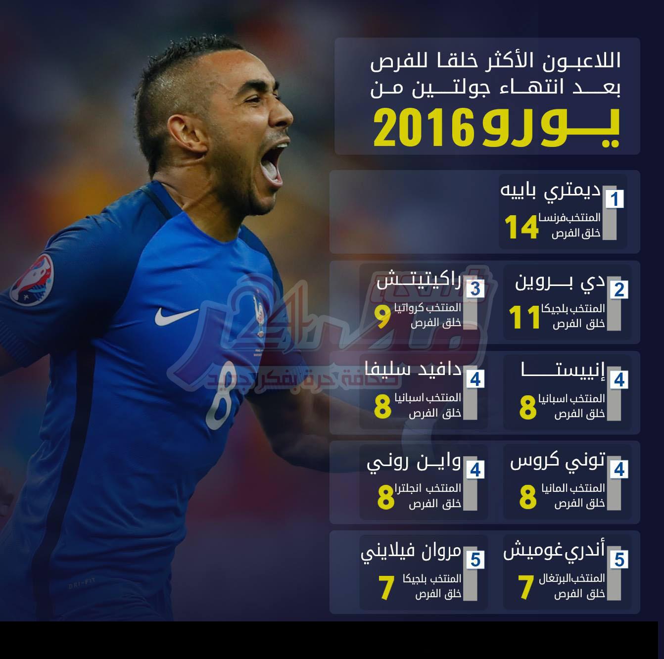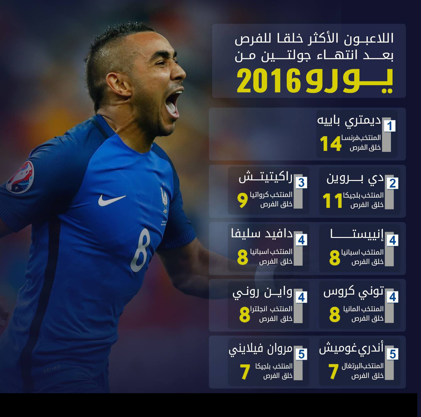 تربع النجم الفرنسي ديمتري باييه على قائمة أكثر اللاعبين خلقا للفرص في يورو 2016 وجاء بعده مباشرة البلجيكي كيفن دي بروين ويتواجد أيضا الإسباني أندريس إنييستا والألماني توني كروس. وهؤلاء وساهموا بشكل كبير في صناعة اللعب، وهنا عرض لأكثر اللاعبين خلقا للفرص في يورو 2016.